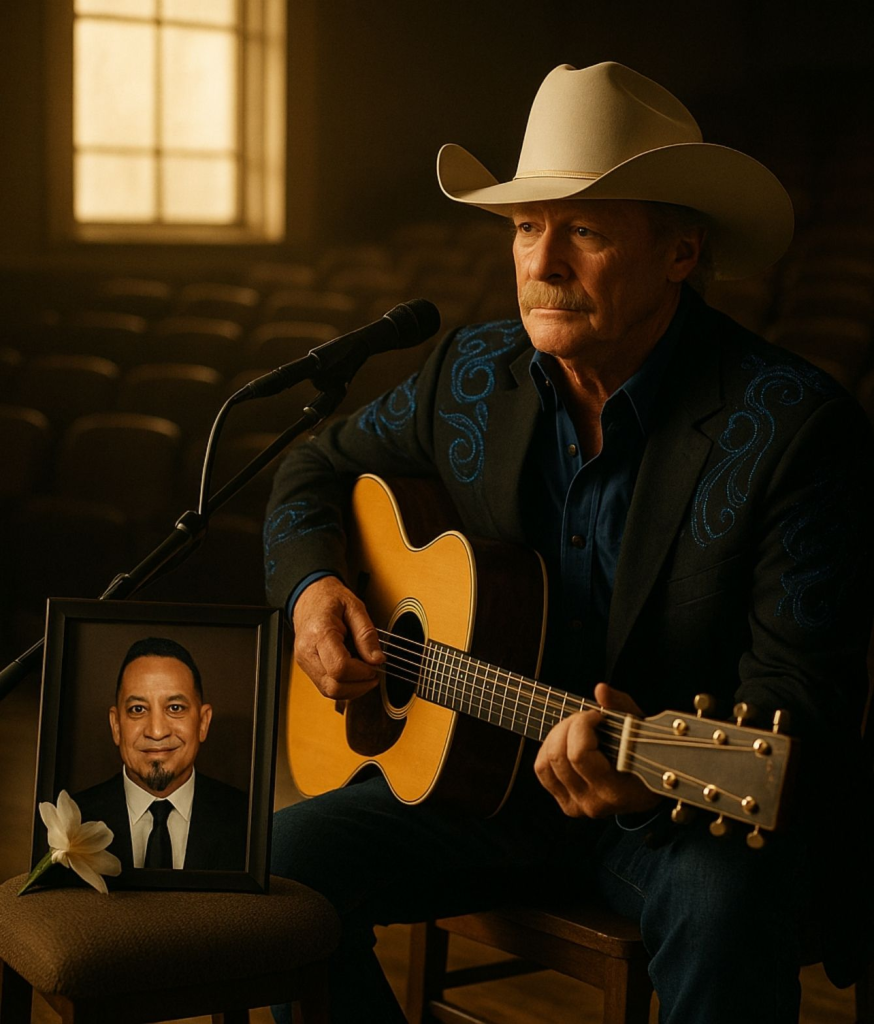 Alan stepped forward, guitar slung low, the brim of his hat pulled so far down it hid half the grief on his face. What it couldn’t hide was everything else — the years etched into his posture, the memories carried in the way he touched the strings, and the heaviness in his breath as he looked around the empty room.
