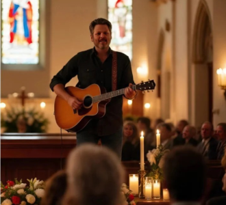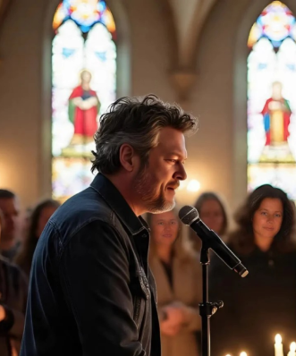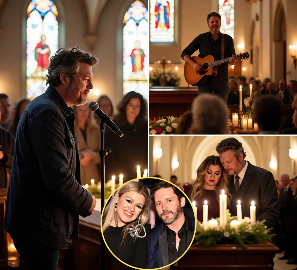 Nashville, TN — The air inside the small country church was thick with grief and candlelight. Friends, family, and a scattering of music industry veterans filled the wooden pews, their whispers fading to silence as Blake Shelton stepped forward, guitar in hand.