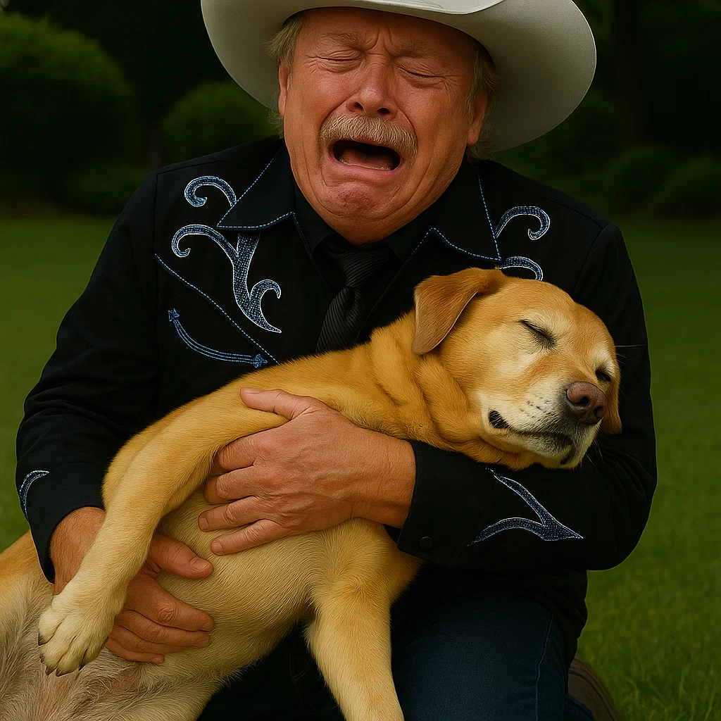 For ten beautiful years, Alan Jackson’s loyal companion walked beside him — not just as a dog, but as family, as a silent witness to every joy, every heartbreak, and every quiet moment in between. Today, Alan holds him one last time, his arms trembling, his tears falling onto the golden fur that had been his comfort through life’s storms.