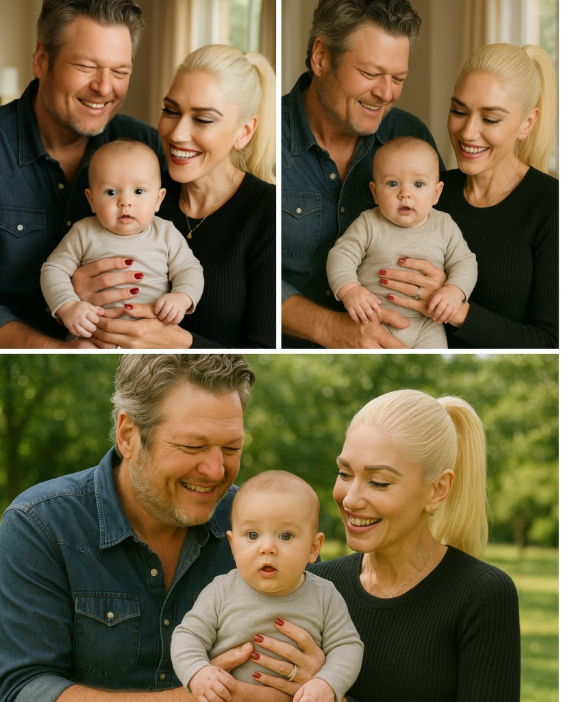 Gwen Stefani stands beside him, her forehead resting gently against Blake’s temple, her entire expression transformed by a glow so pure it seems almost unreal.
