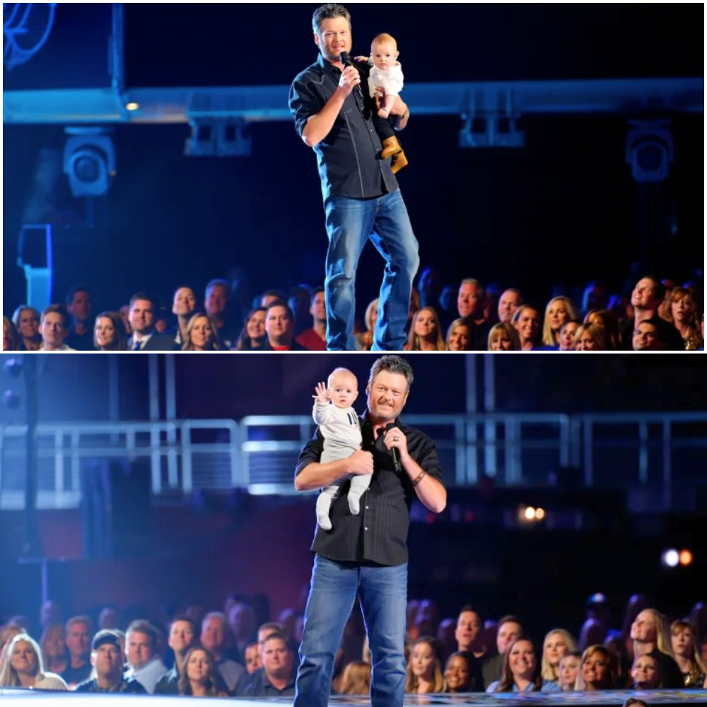 For several seconds, the audience froze. Then the screams began — loud, raw, disbelieving, and emotional enough to shake the stadium’s foundation. Tens of thousands of fans rose to their feet as Blake Shelton, the country king of Oklahoma charisma, held his tiny daughter against his chest.