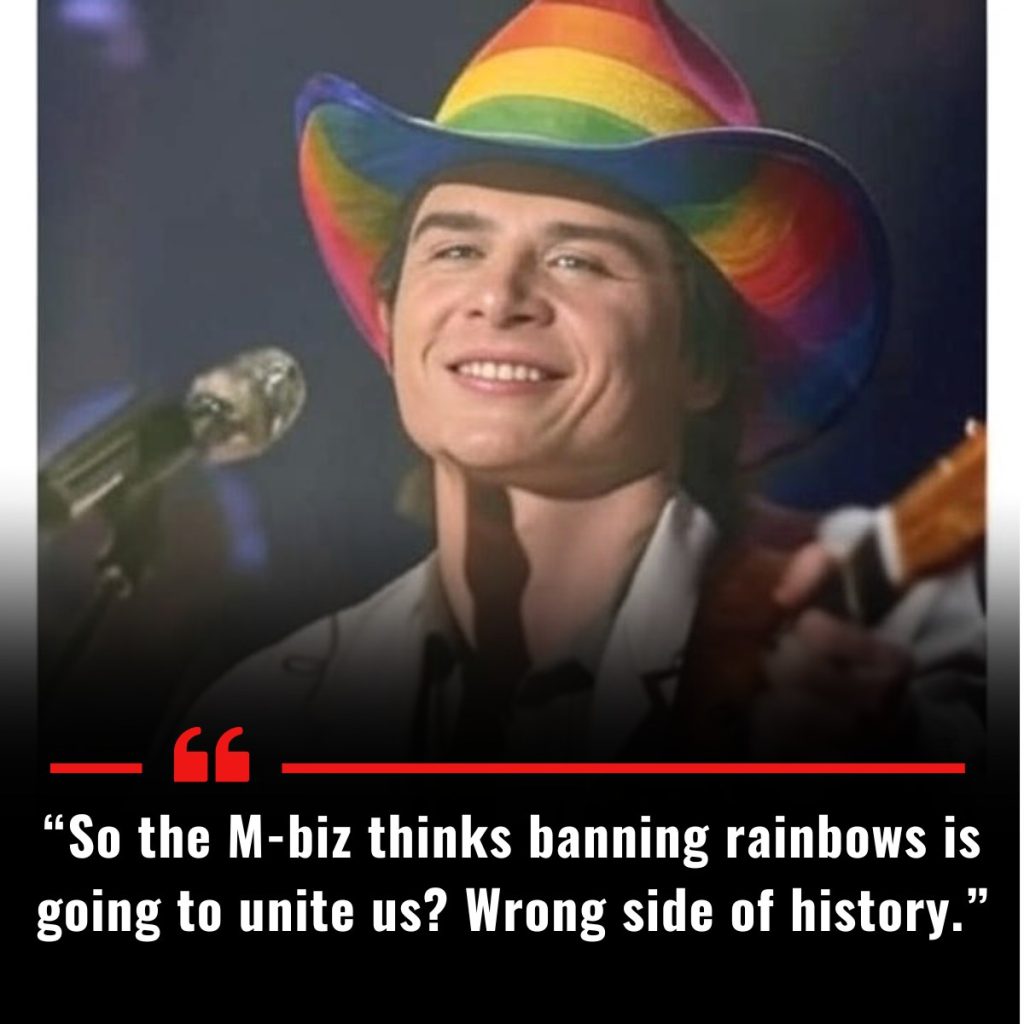 “I don’t care if you’re straight, gay, country, city, black, white, or rainbow-painted head-to-toe — you deserve to feel welcome at any stage, any field, any arena in this country. The M-biz just made a mistake, and I can’t sit quiet about it. You want to ban rainbows? Then you’re banning hope itself. And that ain’t America.”