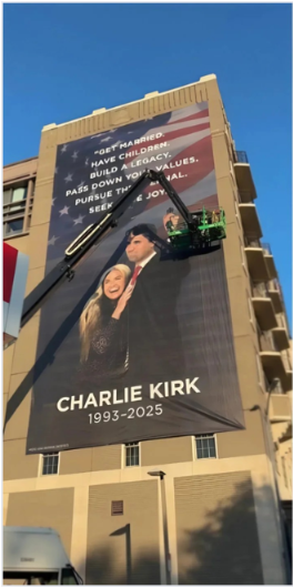 The banner was not a promotional ad, nor a simple tribute to her career. Instead, it carried a message so bold that fans and critics alike could not look away. Written in towering white letters across a deep blue canvas, the banner read: