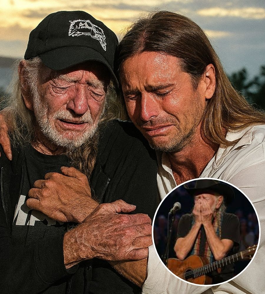 Standing beside him that night was his son, Lukas Nelson — guitar in hand, eyes glistening under the stage lights. There was no backing band, no roadies, no spectacle. Just a father and son, shoulder to shoulder, bound by music and blood.
