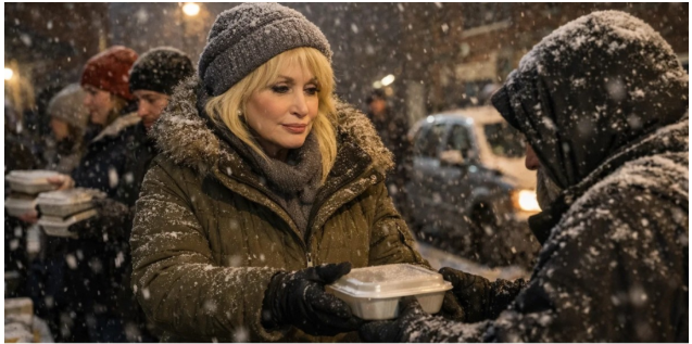 And somewhere inside that freezing chaos, without cameras, without announcements, Dolly Parton showed up.