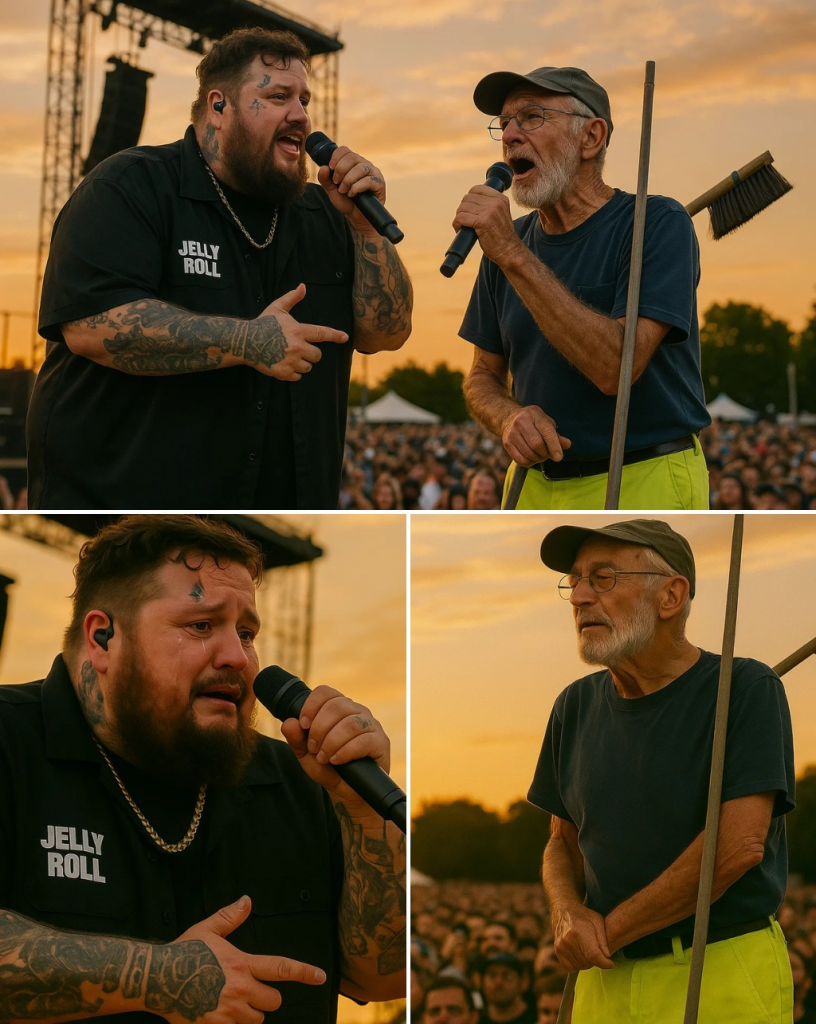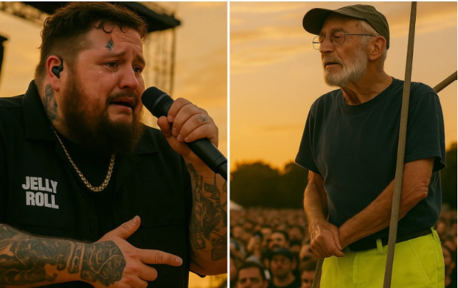 He was nearly invisible at first — a man in a faded work uniform, pushing a broom along the edge of the stage. To most, he was background, a fixture of the arena like the rows of seats or the security guards standing by the exits. But Jelly Roll noticed something that made him stop mid-song.