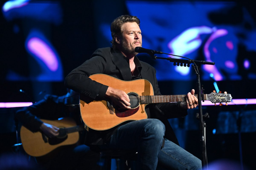 After an energetic performance of “Chattahoochee” by Alan and Blake together, the lights dimmed. Blake remained center stage, holding an acoustic guitar. The band fell silent. A single spotlight followed him as he approached the mic, then turned toward stage left.