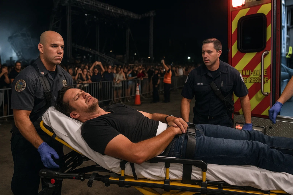 On what was meant to be one of the most electrifying stops of his summer tour, country superstar Luke Bryan was performing to a sold-out crowd at the Miami Bayshore Arena on Saturday night when tragedy struck. At approximately 9:17 PM, midway through his performance of “That’s My Kind of Night,” a loud cracking noise echoed through the venue. Within seconds, part of the front stage platform gave way, sending several crew members and Bryan himself tumbling into the pit area below.