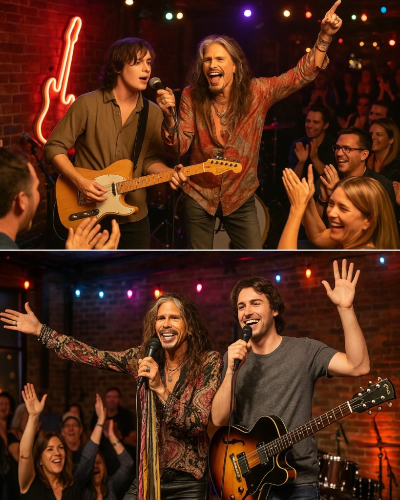 At first, Tyler blended into the back of the crowd, applauding politely as his nephew strummed his way through a set of originals and classic covers. The room — a modest venue with maybe 200 people — buzzed as word spread that the man sitting near the bar was the Steven Tyler.