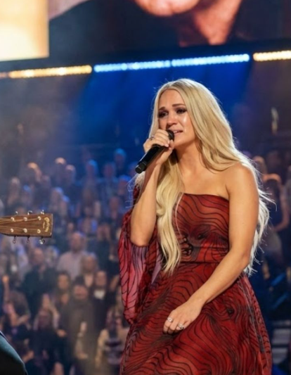 There was no announcement, no dramatic buildup, no flashing lights or countdown. The stage simply softened, bathed in a warm, reverent glow, as if the room itself understood something sacred was about to unfold. And then, almost gently, Vince Gill stepped forward. Beside him stood Carrie Underwood, her posture still, her presence calm yet unmistakably powerful. What followed was not a performance—it was a moment of shared faith, memory, and love that broke every heart in the room.