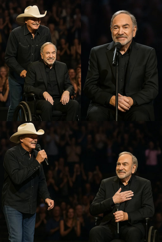 Across the stage stood Alan Jackson — hat tilted low, hands clasped before him, eyes soft with respect. When Neil looked up and met Alan’s gaze, it was clear this wasn’t planned for showmanship. It was two friends, two icons, coming together for something much deeper.