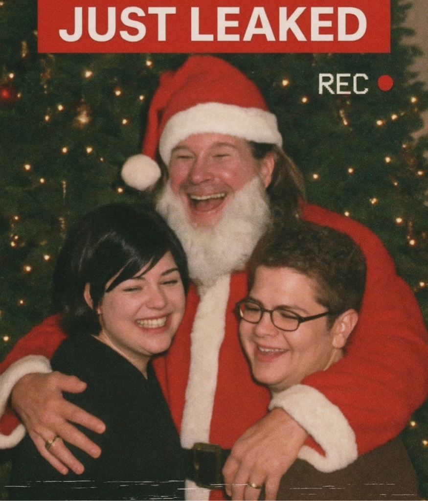 Wearing an oversized red Santa coat, the beard crooked, the hat slipping over one eye. His face was younger, softer, full of mischief. His arms were open wide as Kelly, then 20, and Jack, then 19, ran into the frame.