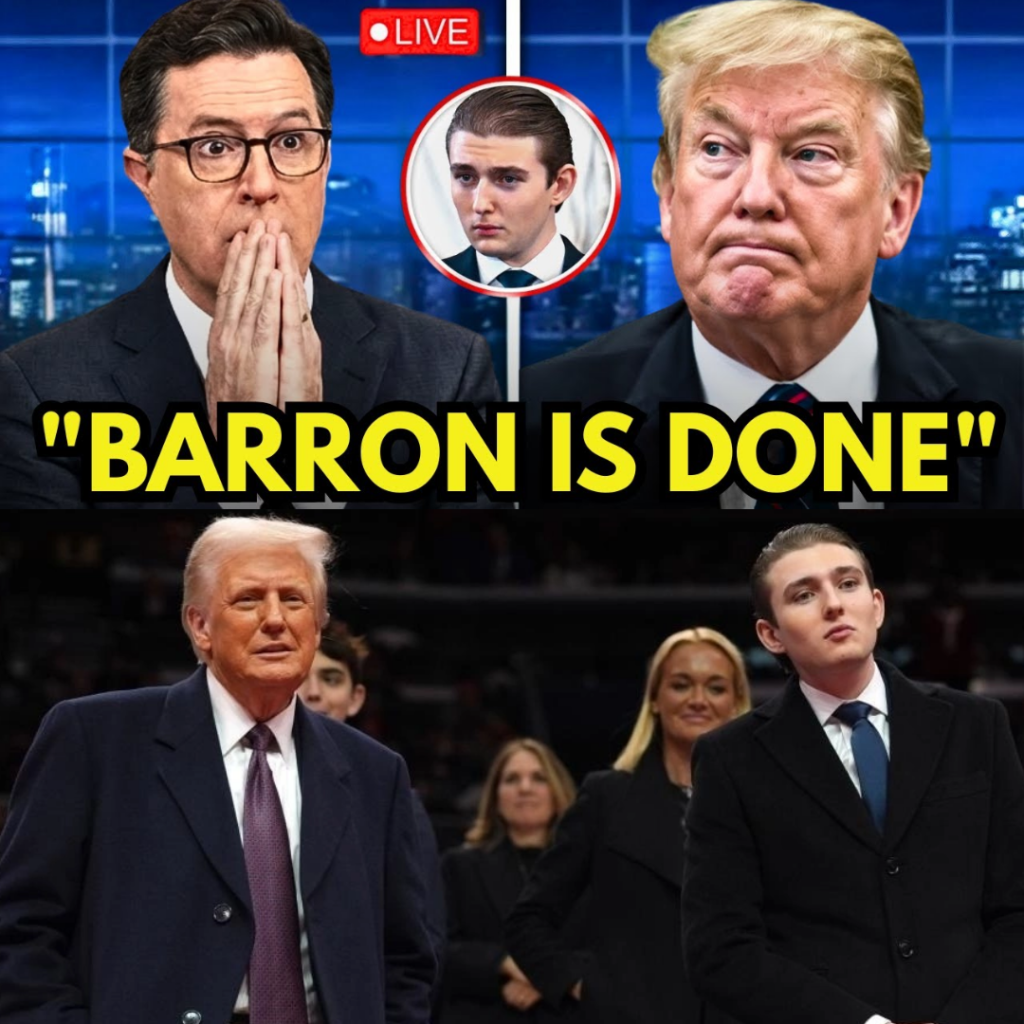 In the span of eight seconds — measured later by producers replaying the clip frame by frame — Stephen Colbert took an insult involving Barron Trump, flipped it with surgical precision, and left Donald Trump metaphorically frozen, his confidence punctured, the room plunged into a silence so thick it felt intentional.