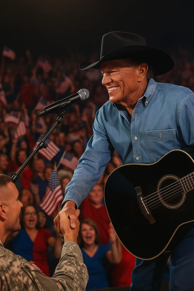Across decades, he’s partnered with organizations like the Military Warriors Support Foundation to present mortgage-free homes to wounded veterans and Gold Star families at his concerts. At one of his later stadium shows, a veteran was brought on stage to receive the keys to a home, and George allowed the crowd to chant “USA, USA, USA,” turning music into tribute.