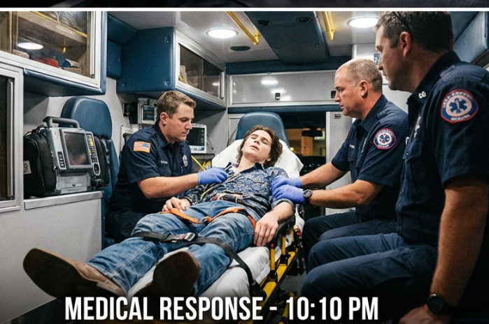 Shelton reportedly waved urgently for medical staff, staying beside Foster as EMTs worked to stabilize him. Within minutes, Foster was placed on a stretcher and transported to a nearby hospital as the crowd stood in stunned silence.