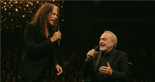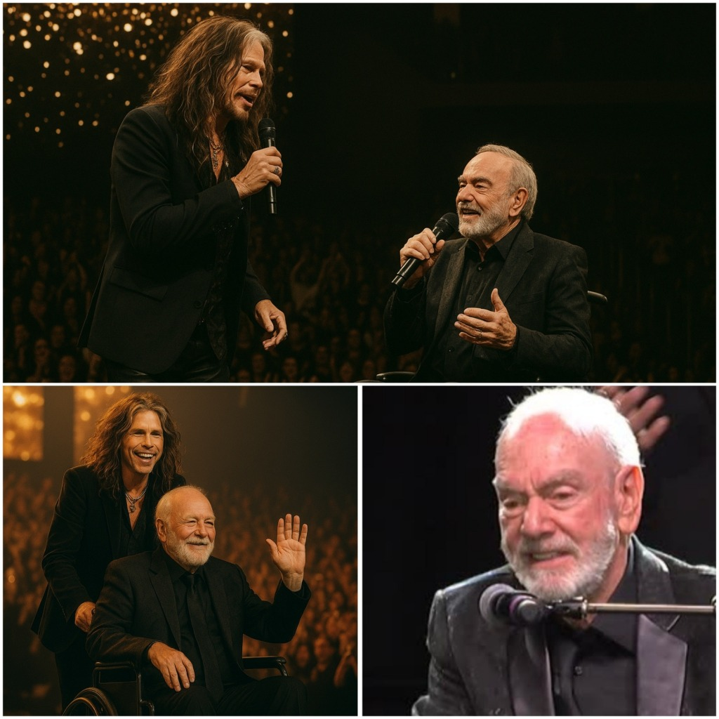 He hadn’t sung live in years — not since the diagnosis stole the steadiness from his hands and the certainty from his voice. But when Steven Tyler stepped into the light and Neil Diamond, 84, took his place at the piano, the theatre fell into a kind of holy silence.