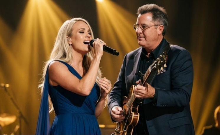 The song—rooted in gospel tradition, familiar yet timeless—rose slowly, like a prayer remembered rather than performed. Carrie’s voice carried clarity and ache in equal measure, her control so precise it felt almost fragile. Vince’s harmonies came not to overpower, but to cradle, adding gravity and age to every phrase.